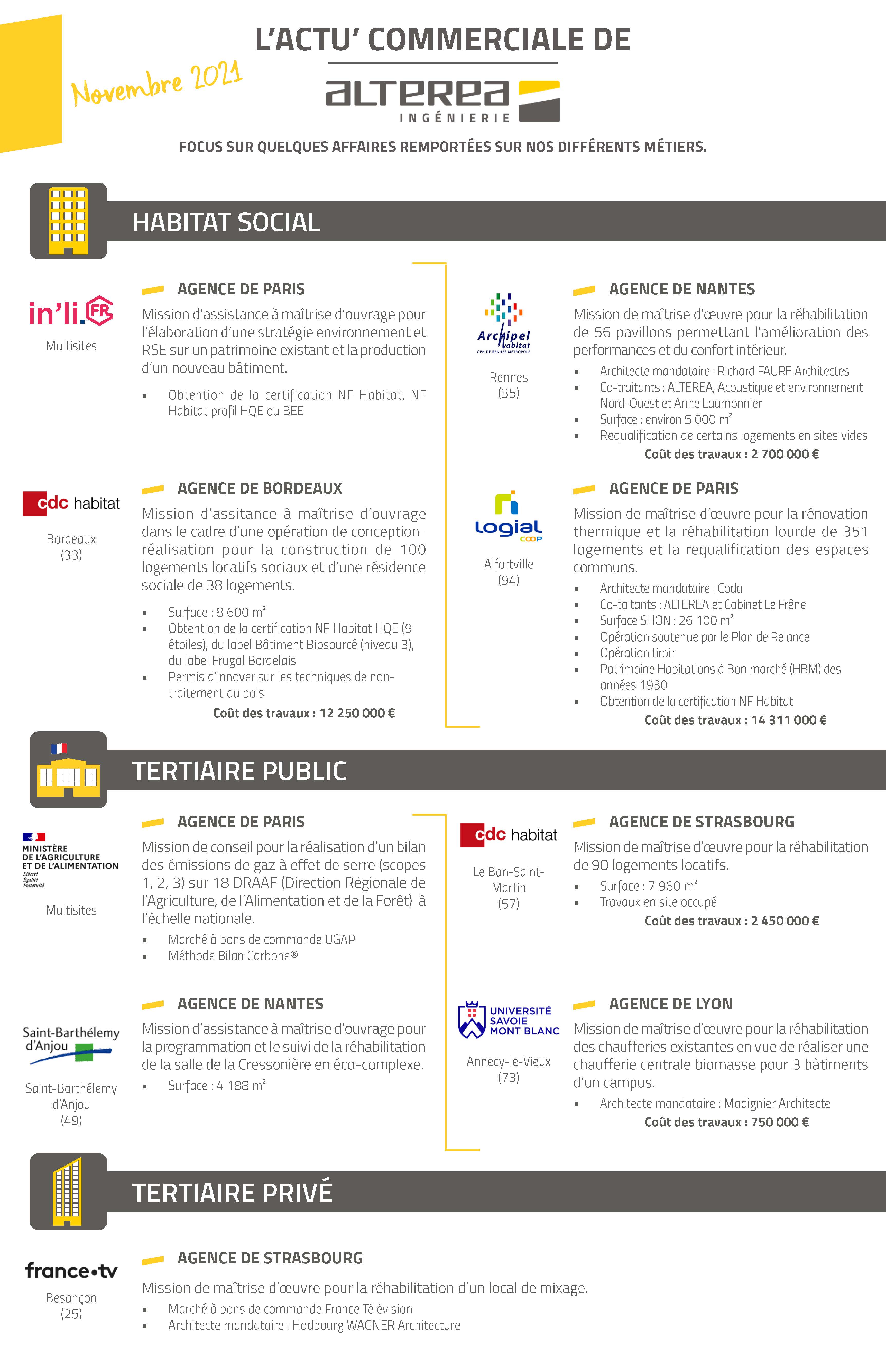 Des opérations de conception-réalisation, de la rénovation thermique, des bilans des émissions de gaz à effet de serre, de la requalification, des stratégies environnement et RSE, voici quelques missions remportées par notre Direction du développement commercial sur le mois de novembre 2021.