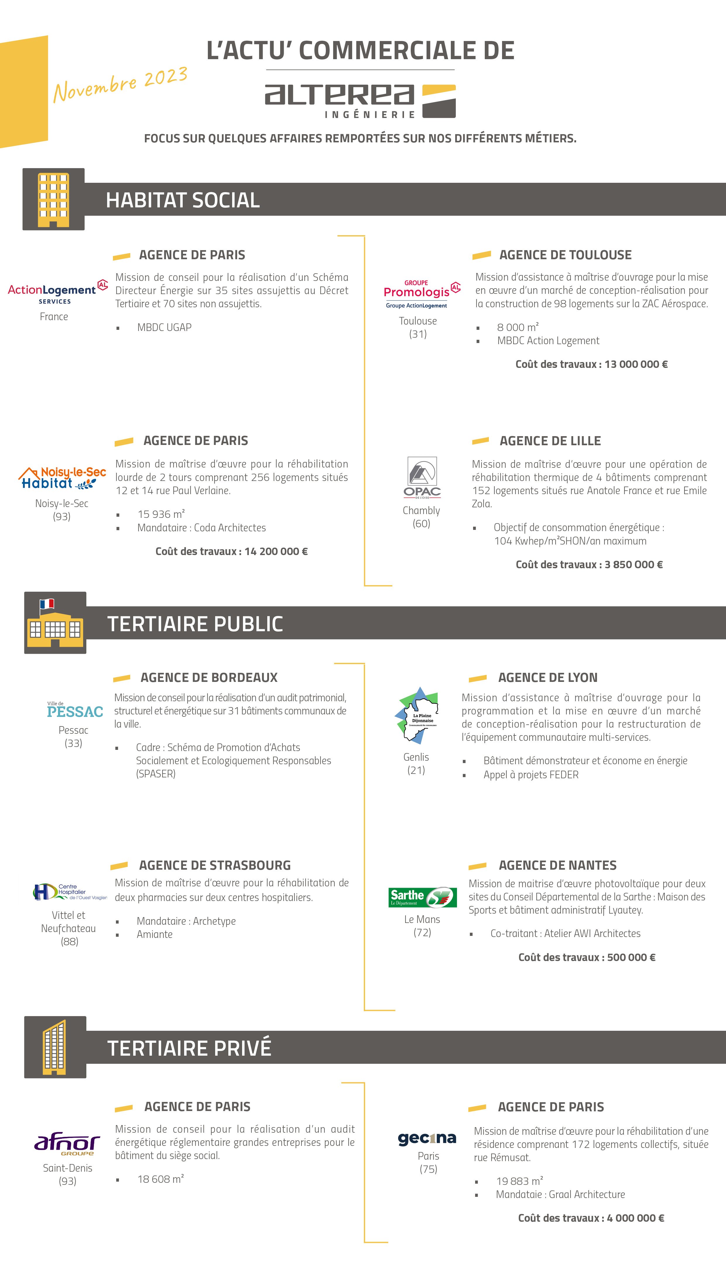 Mission d'assistance à maîtrise d'ouvrage pour la mise en œuvre d’un marché de conception-réalisation pour la construction de 98 logements, mission de maîtrise d'œuvre pour la réhabilitation de deux pharmacies sur deux centres hospitaliers, mission de conseil pour la réalisation d’un audit patrimonial, structurel et énergétique sur 31 bâtiments communaux, voici quelques missions remportées par notre Direction du développement commercial sur le mois de novembre 2023.