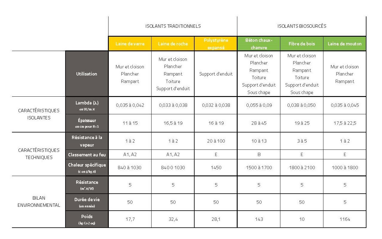 Ci-dessous, un tableau comparatif entre les isolants traditionnels et les isolants biosourcés :